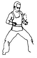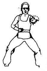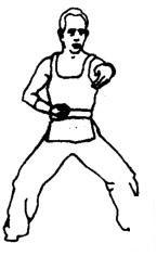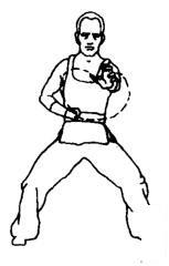 上动不停,身体右转成马步。同时左掌经前向上弧形运行收至头部左侧。随之右拳收至右腹前。