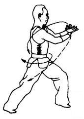 步型不变,左拳变掌略屈肘向里收。同时右拳变掌从左小臂外侧向左上方穿出,与左臂成交叉。