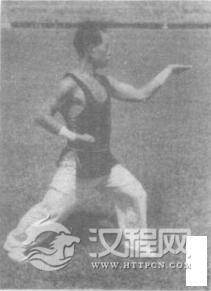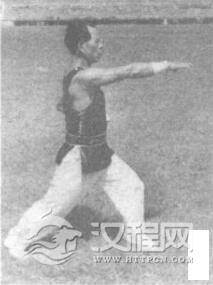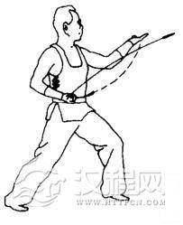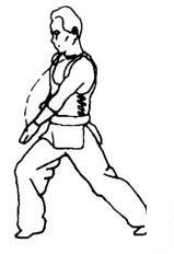 身体右转成右弓步。同时右掌向上经面前向右挑格,并顺势收回腰问变拳。随之左掌臂内旋下沉,再直臂向前摆动成膀桥势。