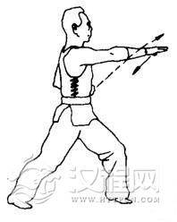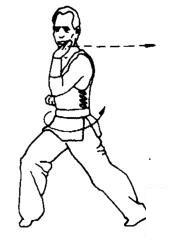 上动不停,右拳变掌向前直插。随之右掌屈肘收回腰间。眼看右掌。