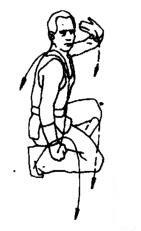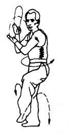 左脚提起,身体稍右转。同时左掌经下向右后绕行至右肩前,右掌随之向后向上绕行。目视左侧。