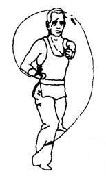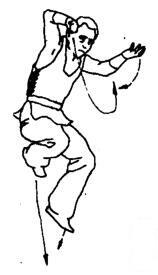 上动不停,右脚蹬地跳起腾空,身体在空中向左转体180度。同时两掌顺势经上向左绕行。