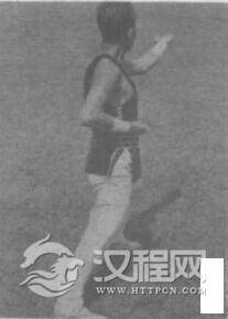 上动不停,身体左后转向北成左弓步。同时左双指手顺势向前伸出。