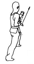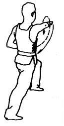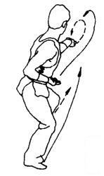 步型不变,左双指经下逆时针向里绕行,随即屈肘向左肩上挑格。目随左手动。