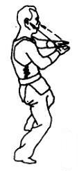 上动不停,两掌臂内旋经上向前弧形伸出,随即屈碗下挫。掌心相对,碗与肩同宽同高。目视前方。