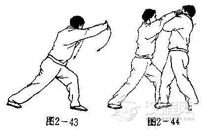 【用法】卧牛为贴身短打之法,拳诀云:“跌步卧牛双倒,遭着叫苦连天。”如上势我以箭手穿插敌喉,敌如格抓,我则就势采制其腕,迅即以右掌猛扑敌面(图2-44)。