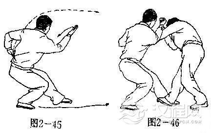 【用法】坠肘跌为连化带跃之法.我扑击敌面,敌必格架反击,我连坠肘回坐,以右小臂抖压敌肘关节(图2一46).