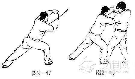 【用法】我坠肘跌敌,敌如回挣,我则乘势以坠压之手采制其腕,同时迅速由敌左外侧抢步进身,迅即以左掌或拳猛贯敌面(图2-48).