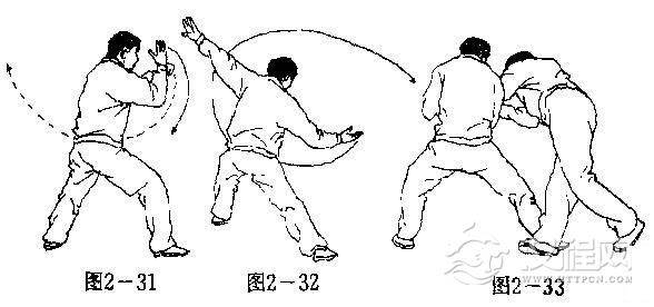 【用法】翻打跌为贴身快跌之法.我以箭手插击敌目,敌又招架,我则就势采制其腕,并以前脚管住敌腿,同时以右掌制住敌肘,随即猛然拧腰转髋,将敌向左侧方扭映(图2-33).