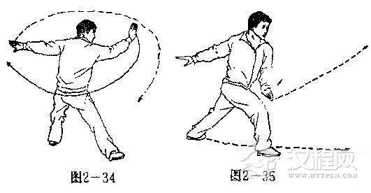 接上势,右掌经体前向左经上向体右侧后方牵挂(图2-34),上动不停,腰身右拧,重心前移,两腿成右弓步;同时,左掌随转体之势由上向前下方劈压;右掌随转体之势摆于体后(图2-34, 35)。