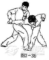 【用法】披挂跌为连打带跌之法,拳诀云:抛架子抢步披挂,补上腿那怕他识,右横左采快如飞,架一掌不知天地.”我以翻打跌跌敌,敌如化解反击,我则就势采挂敌手,同时以左掌猛劈敌肘,使其跌仆(图2-36).