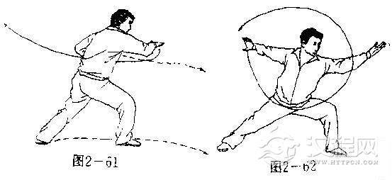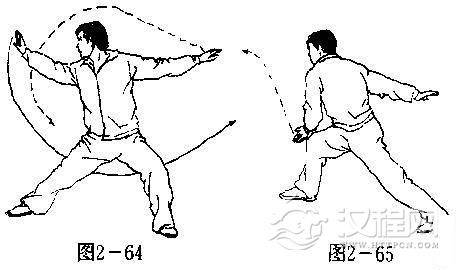 (1)右手由右经体前向左经上往右侧撩挂,目随右手.(图2-64);