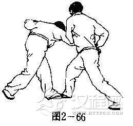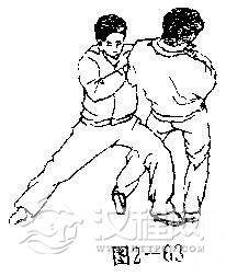 【用法】朝阳手为近身快跌之法。拳诀云:“朝阳腿偏身防腿,无缝锁逼退英豪,仍阵势弹他一脚,好教师也丧声名。”如上势我避敌来势后,可伺机抢进管住敌腿,使其欲走不能,迅即以右手叉制敌臂,以左掌猛击敌胸,使其跌倒(图2一63)。