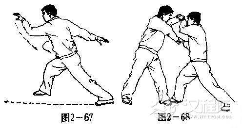 接上势,左手成虎爪状,由一下向前上擒拿,手心朝外.目随左手(图2-67).