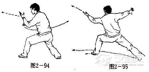 (2)上动不停,重心猛然前移成左弓步,左掌随前弓之势向左前方推击,掌心斜向上,右掌向右后侧分开,掌心向后(图2-95).