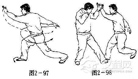 【用法】我以落步朝旧跌故,故如闪退化解,我须疾步跟进封住敌左腿,使其欲走不能,迅即以左掌猛推敌胸,使其跌倒(图2一96).