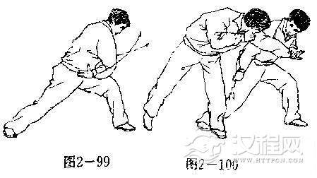 【用法】我挥击敌面,敌必以手招架,我则就势采拿其腕,迅即段身猛然向左拧转,以右肩猛扛敌臂,使其关节受损〔图2一100).