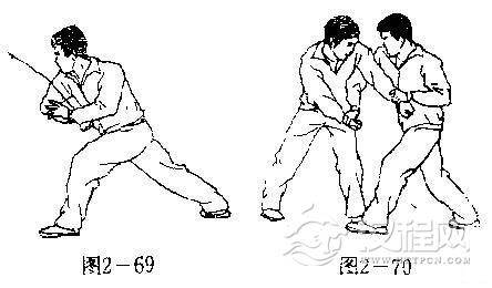 【用法】背机又名‘拗鸾肘”,是一个反筋背骨的贴身跌打技法。拳诀云:“拗莺肘出步颠剁,搬下掌摘打其心,拿阴捉兔硬开弓,手脚必须相应。”如上势,我采制敌腕后应迅速逼近,以右肘猛扑敌竹,使只关节受损(图2-70).