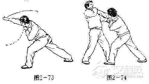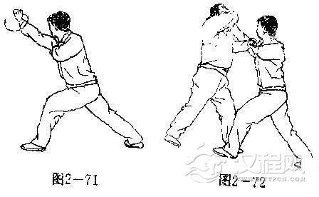 【用法】我扑击敌肘,敌必坠肘化解,我责乘机翻劈故面(图2一72).