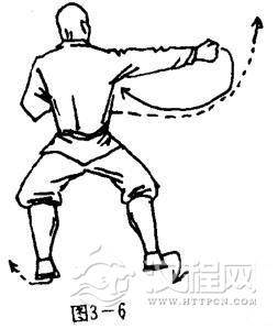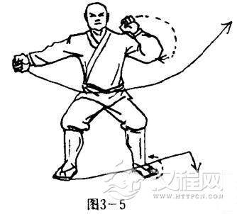 右脚离地抬起,左脚为轴,体左转180度,右脚在左脚内侧一步震脚下落,两腿成马步,同时,右拳随势旋转,横扫于体右侧,拳心向前,拳眼向上;左臂屈肘左拳护于左肋前侧,拳心向内,拳眼向上.目视右侧方(图3-6).