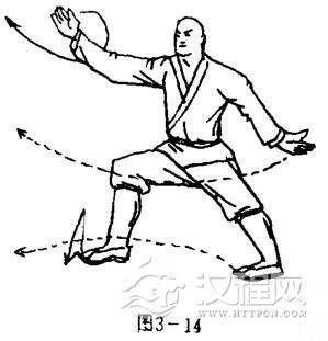 两脚蹍地,体右转90度,两腿成右弓步,同时,右掌由前向上挑拨,高与头平,掌心向左,掌指斜向上。左掌展于身后左下侧,掌心斜向下,掌指斜向后。目视右掌(图3-14).