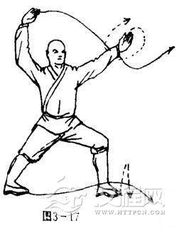 抬右脚原地震脚落地,休右转90度,左脚前上一步,两腿成左弓步,同时,右掌旋腕缠拧,再上架头上右后侧,掌心向右,掌指斜向前,左掌穿摆于头前上方,掌心斜向前,掌指斜向上。目视前方(图3-17)