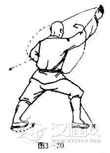 左脚跟内旋,体左转90度,两腿成左弓步,右脚离地,向前移再猛力后勾,落地仍然左弓步不变,同时,右掌由右向左环半弧下按,再抬左掌沿右臂滑抹切击,右臂再屈肘上提右掌护于右侧前方,掌心斜向前,掌指斜向内,左掌展于左侧,掌心向前,掌指向外.目视前方(图3-21).