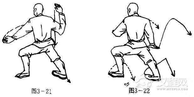 上动不停,右脚向后滑步,两腿左弓步不变,同时,右掌向前下方猛力按击,掌心向下,掌指向前,左掌再沿右小臂向肩头滑抹,紧护于右肩前侧,掌心向内.掌指向外.目视前方(图3-22).