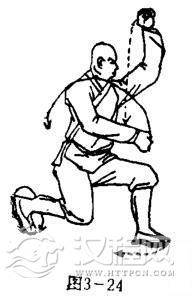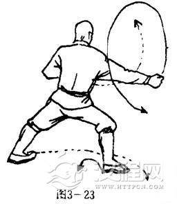 两脚离地踮跳,体右转90度,前后换步落地,两腿成跪步,同时两拳随势环弧,右拳冲于前下方,拳心向左,拳眼向上,左拳架于头前上方,拳心向右,拳眼斜向下.目视前下方(图3-24)。