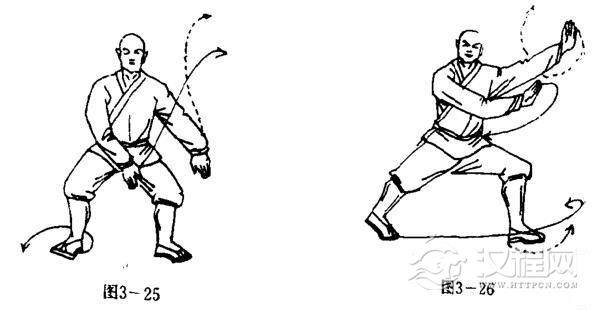 上动不停,两脚为轴,体左转90度,两腿成左弓步,同时,两掌向前推击,掌心斜向前,掌指斜向上.目视右前侧(图3-26).