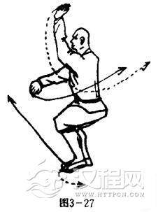 右脚离地抬起,左脚为轴,体左转180度,右脚向左脚并步震脚下落,两腿屈膝半蹲,同时,右掌随势,向前下方揣击,掌心斜向下,掌指斜向左,左掌架于头上前方,掌心向上,掌指斜向右。目视前方(图3-27 )。