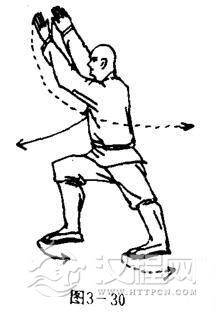 两脚原地不动,双掌收回再同时向前右上侧猛力推击,掌心斜向右,掌指向上.目视右前侧方(图3-30).