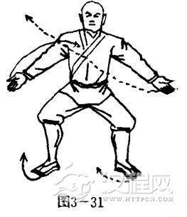 两脚蹍地,体左转90度,两腿成马步,同时两掌随势向两下侧穿击,掌心斜向下.掌指斜向外.目视前方(图3-31).