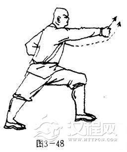 左脚在前方一步下落,两腿成左弓步,同时,两掌变拳,右拳直臂猛向前冲,拳心向左,拳眼向上,左臂屈肘左拳护于左肋前侧,拳心向右,拳眼向上,目视前方(图3-48).