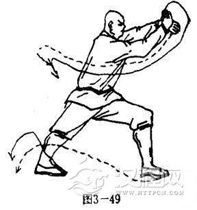 两脚原地不动,两拳变掌,右掌反腕用掌心向前拍击左掌背,左掌用掌背向前方迎击右掌心,两掌紧握.掌心斜向下,掌指向外。目视两掌(图3-49).