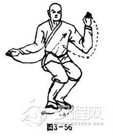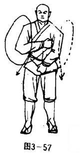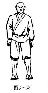 两脚蹍地.体右转90度,两脚成小八字步站立;同时,两掌变拳,屈肘抱于体前,左拳护于腰间前侧,右拳护于左肋前侧,两拳心向内,拳眼斜向上.目视前方(图3-57).
