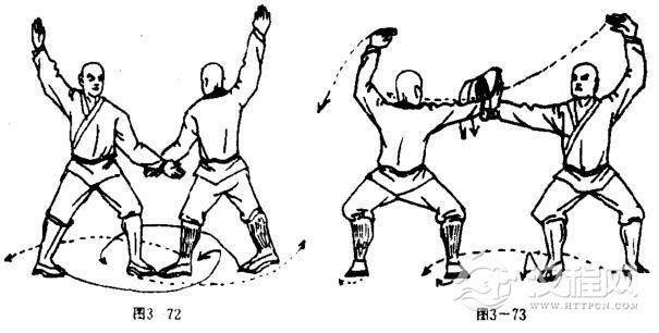 甲乙双方抬右脚前上一步,震脚落在对方左脚后侧.左脚抬起,体左转270度,左脚在右脚内侧一步下落,两腿屈膝成马步,同时,双方右掌随势推向右侧方,掌心向右,掌指向上;左掌横架头上左侧,掌心斜向前,掌指向右.双方互相目视(图3-73).