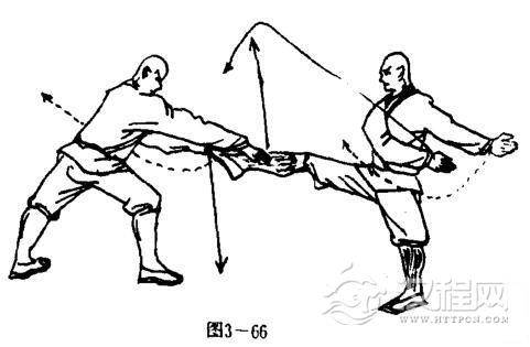 乙两脚离地前后换步,两腿成右弓步,同时两掌由上向下拍击甲踢来的右腿,两掌心向下,掌指向前.目视甲腿部(图3-66).