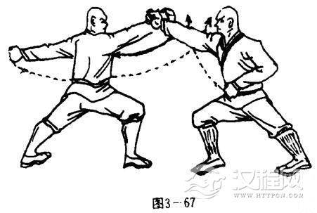 乙两掌变拳,右拳向上拨架甲右拳,拳心向左,拳眼斜向上,左拳展臂摆于体后左侧,拳心向左,拳眼斜向上.目视甲左肩(图3-67).