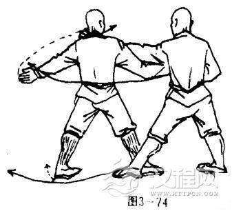 甲被拿后两脚为轴旋转,成高叉步,左掌展于体左侧,掌心斜向前,掌指向左,右手被拿.目视右前侧(图3-74)。