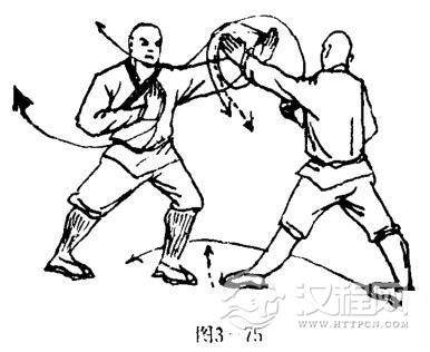 乙两脚原地不变,右臂屈肘右掌护胸前,掌心向前,掌指向上,左掌不变。目视甲左掌(图3-75 ).