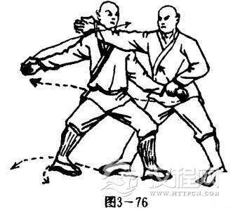 甲左手被拿,右掌外展于体右后侧,掌心斜向右,掌指斜向后.目视乙头部(图3-76 )