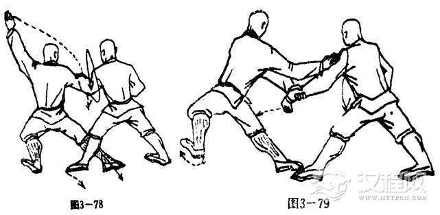 乙左脚被绊住后抬起后移,摆脱甲右脚的勾绊,成高叉步;左掌被擒,右臂屈肘右掌护胸,掌心向前,掌指向上.目视右前侧(图3-79)。
