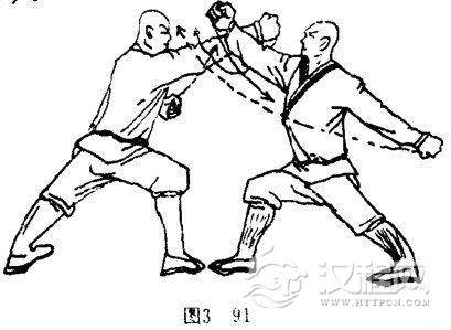 甲两掌变拳,右拳上架乙右拳,拳心向左,拳眼斜向上;左拳展于体左后侧,拳心向右,拳眼向下。目视乙头部(图3-91)