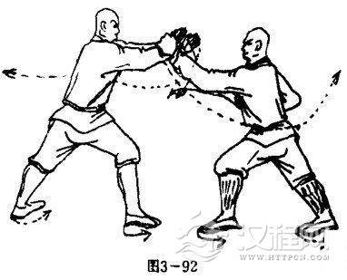 乙右弓步不变,同时两拳变掌,向甲左臂猛力推击,两掌心向外,掌指向上。目视甲头部(图3-92).