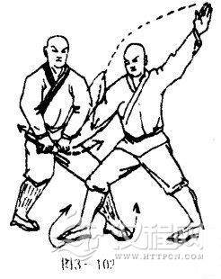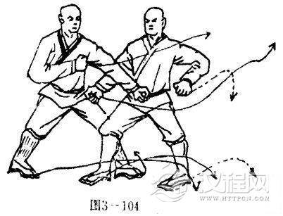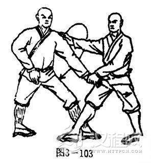 甲重心被迫前移,两腿变成左弓步,同时,左掌被抓.右臂屈肘右掌护于腰间前侧,掌心向内,掌指向下.目视左前侧(图3一103).