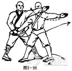 乙左脚尖内旋,右脚尖外旋,两腿成又步,右掌被擒,左掌外展于左侧方,掌心向前,掌指向左。目视乙左嘴(图(3一98).