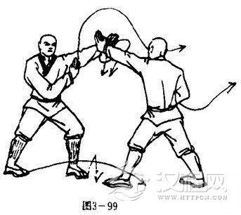 甲两腿成右亏步,左掌不变,右臂屈肘右掌护于脚前,掌心斜向左,掌指斜向上.目视乙左臂(图3一99)。