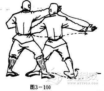 乙两腿变成高叉步。同时,左掌被拿,右掌外展于右后侧方,掌心向右,掌指向后。目视甲右臂(图3一100)。