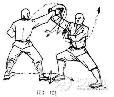 甲两腿变成右弓步,同时,右掌不变,左骨屈肘左掌护于胸前,掌心斜向右,掌指斜向上.目视乙右臂(图3一101).